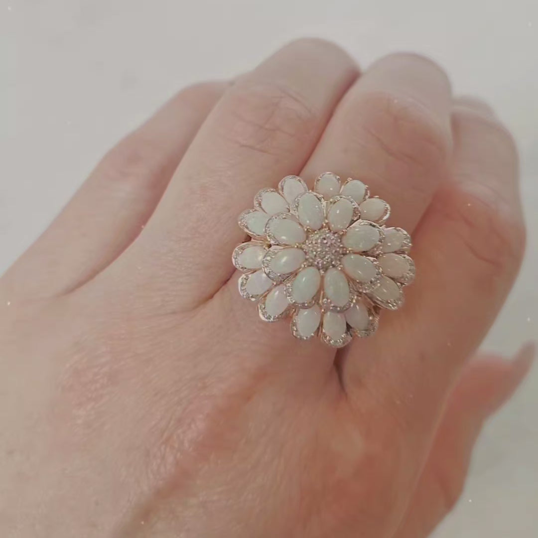 This charming 14 karat flower golding with bright opal enchants with 68 brilliant (0.40ct) and 23 opals in the oval cabochon cut (2.30CT). The cocktail ring in the form of 585 yellow gold has a diameter of 2.4 cm and is a real eye -catcher. Let yourself be enchanted by the beauty of the opal and treat yourself to this unique piece of jewelry!