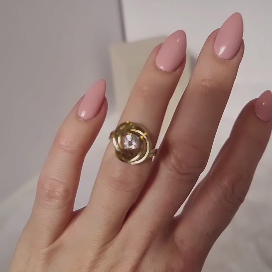 This unique solitary ring made of 14 karat gold captivates with its unusual design. The 585 yellow gods shine beautifully and is crowned by a sparkling 0.54ct brilliant. The node -shaped ring head has a diameter of approx. 1.5 cm and the ring size is 52.5. A truly luxurious piece of jewelry that will adorn every finger.