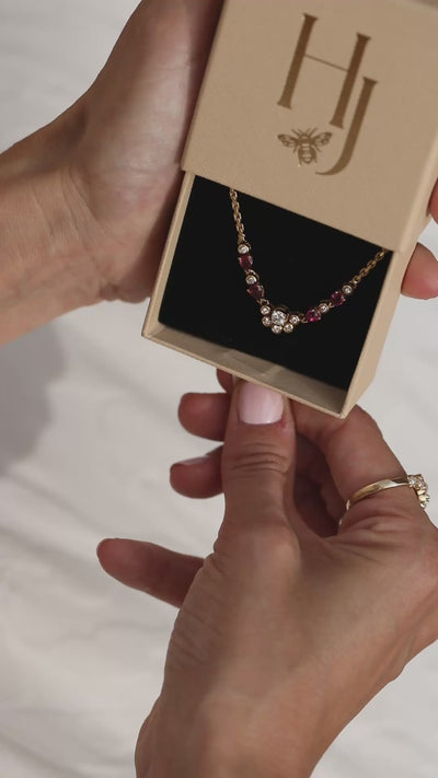 Das Collier liegt geschmeidig am Hals an und betont wunderschön das Dekolleté. Ideal als eleganter Akzent zu einem Abendkleid, aber auch als luxuriöses Statement zu schlichter Kleidung. Wer möchte, kombiniert dazu filigrane Goldohrringe oder ein passendes Rubinarmband.